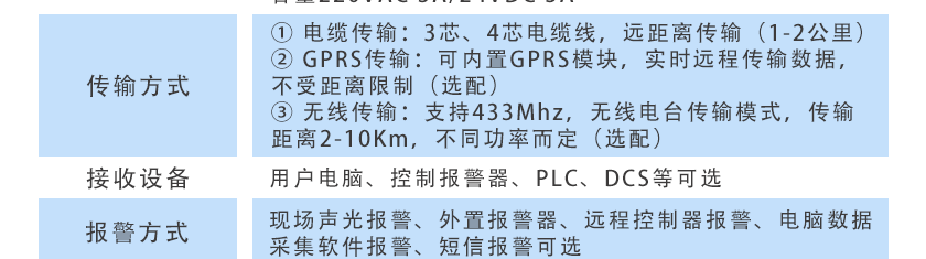 ①電纜傳輸:3芯、4芯電纜線,遠(yuǎn)距離傳輸(1-2公里)②GPRS傳輸:可內(nèi)置GPRS模塊,實(shí)時(shí)遠(yuǎn)程傳輸數(shù)據(jù),不受距離限制(選配)③無(wú)線傳輸:支持433Mhz,無(wú)線電臺(tái)傳輸模式,傳輸距離2-10Km,不同功率而定(選配) |
