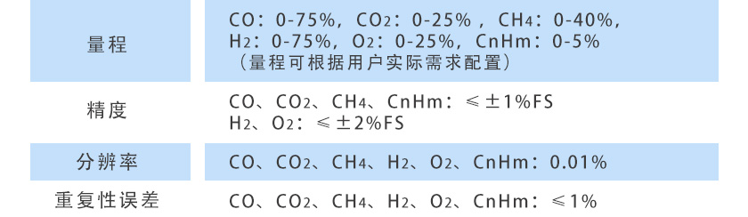 CO:0-75%,CO2:0-25% ,CH4:0-40%,H2:0-75%,O2:0-25%,CnHm:0-5% (量程可根據(jù)用戶實際需求配置) |