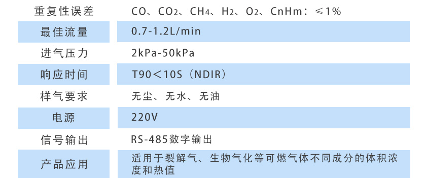 CO、CO2、CH4、CnHm:≤±1%FS;H2、O2:≤±2%FS |