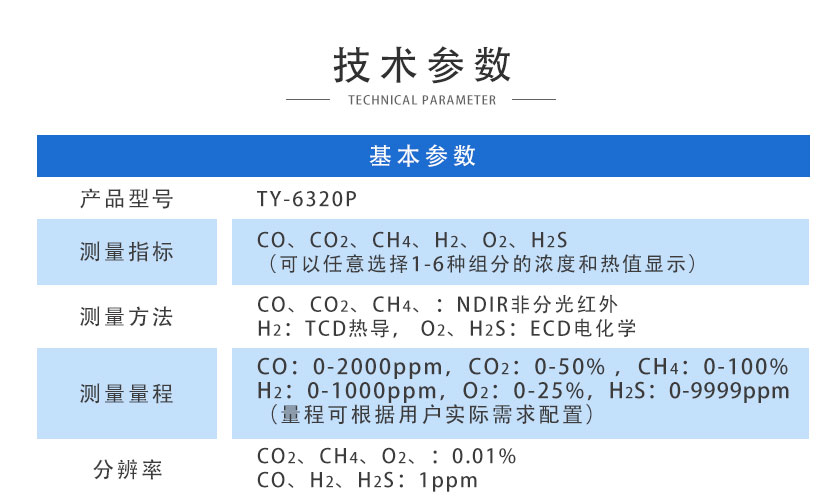 CO、CO2、CH4:NDIR非分光紅外;H2:TCD熱導(dǎo); O2、H2S:ECD電化學(xué) |