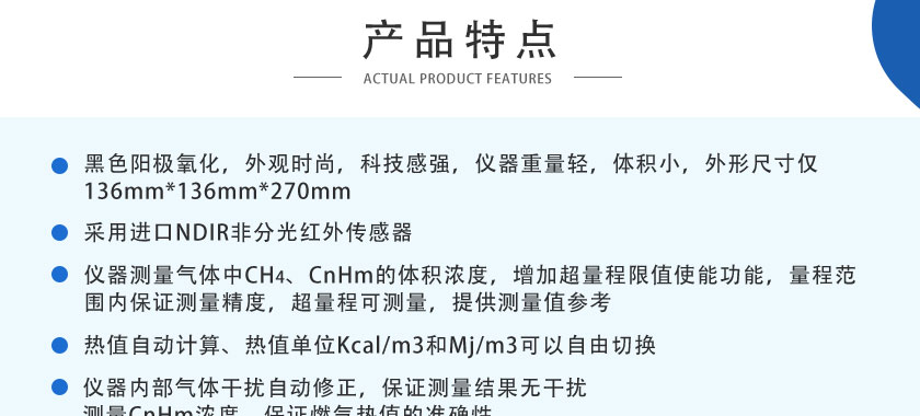 采用自主知識(shí)產(chǎn)權(quán)的NDIR非分光紅外技術(shù),主要用于測量氣體中的CO、CO2、CH4、C3H8、SO2、NO等氣體的體積濃度及熱值。全進(jìn)口傳感器、測量精度高、結(jié)構(gòu)簡單、維護(hù)方便,軟件功能強(qiáng)大,可拓展性強(qiáng)、現(xiàn)場實(shí)用性好,目前暢銷國內(nèi)外。