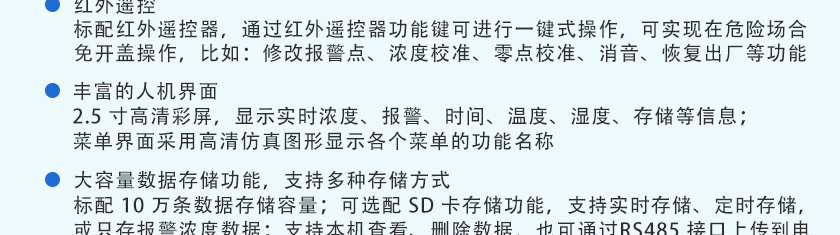 CO(0~1000ppm)、H2S(0~100ppm)、O2(0~30%Vol)、Ex(0~100%LEL),其他量程可訂制 |