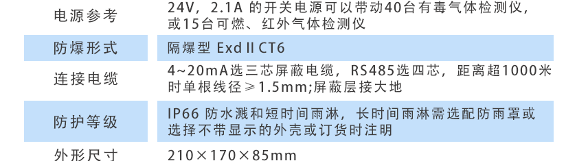 24V,2.1A 的開關(guān)電源可以帶動40臺有毒氣體檢測儀,或15臺可燃、紅外氣體檢測儀 |