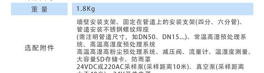 墻壁安裝支架、固定在管道上的安裝支架(四分、六分管)、管道安裝不銹鋼螺紋焊座 (需注明管道尺寸,如DN50、DN15...)、常溫高濕預(yù)處理系統(tǒng)、高溫高濕度預(yù)處理系統(tǒng)、 高溫高濕高粉塵預(yù)處理系統(tǒng)、減壓閥、流量計、溫濕度測量、大容量SD存儲卡、防雨罩、 24VDC或220AC采樣泵(采樣距離10米)、真空泵(采樣距離大于40米)、24V開關(guān)電源 |