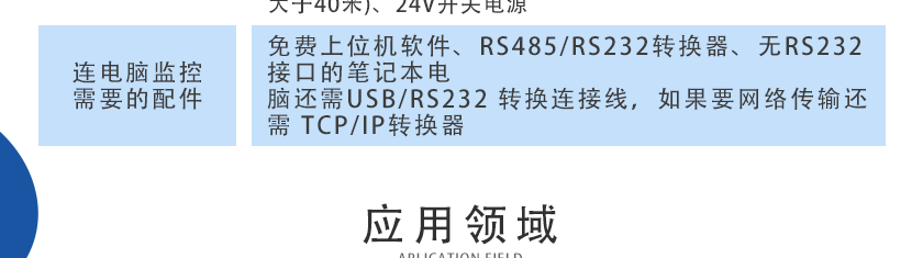免費上位機軟件、RS485/RS232轉換器、無RS232接口的筆記本電腦還需USB/RS232 轉換連接線,如果要網絡傳輸還需 TCP/IP轉換器 |