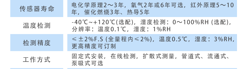 電化學原理2~3年,氧氣2年或6年可選,紅外原理5~10年,催化燃燒3年、熱導5年 |