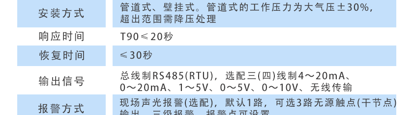 固定式安裝,在線檢測,擴散式測量,管道式、流通式、泵吸式可選 |