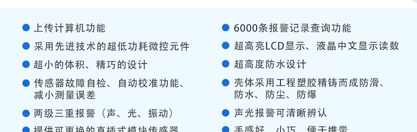 采用進(jìn)口催化燃燒傳感器和微控制器技術(shù),帶2.5寸高清彩屏實(shí)時(shí)顯示,帶聲光+視覺報(bào)警,現(xiàn)場(chǎng)多種氣體濃度 24 小時(shí)連續(xù)在線監(jiān)測(cè)及溫濕度的測(cè)量,適用于各種環(huán)境中的可燃?xì)怏w濃度檢測(cè),響應(yīng)速度快,測(cè)量精度高,穩(wěn)定性和重復(fù)性好,整機(jī)性能居國(guó)內(nèi)領(lǐng)先水平。儀器具有多種超強(qiáng)的電路保護(hù)功能,可防止錯(cuò)接電源、反接電源、電源短路、電源不穩(wěn)、電源與信號(hào)錯(cuò)解等,導(dǎo)致的儀器損壞。