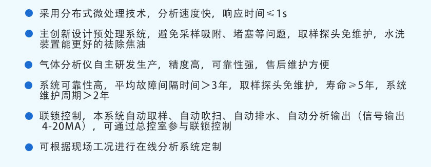 TY-8300型煤氣在線分析系統(tǒng)是天禹智控自主研發(fā)新型在線監(jiān)測系統(tǒng),該產(chǎn)品基于非分光紅外(NDIR)氣體分析技術(shù)、長壽命電化學傳感技術(shù)以及基于MEMS的熱導(dǎo)技術(shù),可同時在線測量煤氣的熱值,以及CO、CO2、CH4、H2、O2、CnHm等氣體的體積濃度。預(yù)處理系統(tǒng)采用冷干法設(shè)計,關(guān)鍵部件采用原裝進口,可根據(jù)現(xiàn)場不同的工況條件,為客戶定制解決方案,保證分析系統(tǒng)的可靠運行。