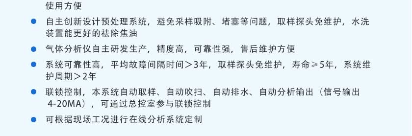 TY-8300型煤氣在線分析系統(tǒng)是天禹智控自主研發(fā)新型在線監(jiān)測系統(tǒng),該產(chǎn)品基于非分光紅外(NDIR)氣體分析技術(shù)、長壽命電化學(xué)傳感技術(shù)以及基于MEMS的熱導(dǎo)技術(shù),可同時(shí)在線測量煤氣的熱值,以及CO、CO2、CH4、H2、O2、CnHm等氣體的體積濃度。預(yù)處理系統(tǒng)采用冷干法設(shè)計(jì),關(guān)鍵部件采用原裝進(jìn)口,可根據(jù)現(xiàn)場不同的工況條件,為客戶定制解決方案,保證分析系統(tǒng)的可靠運(yùn)行。