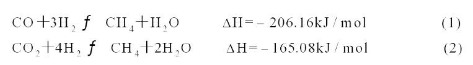 由于焦?fàn)t煤氣中CO荷CO2的總含量約為10%(v/v),多碳烴的含量為2~3%,以及約55%(v/v)的H2,所以可以利用甲烷化反應(yīng)生成甲烷,主反應(yīng)見反應(yīng)式(1)和(2):
