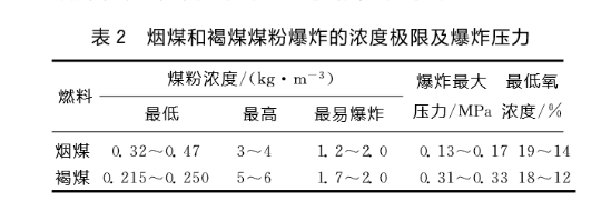 (3)煤粉濃度。煤粉和空氣混合在一定濃度時(shí),由于明火或煤粉沉積物自燃而引起爆炸。煤粉爆炸性隨著它在空氣中的濃度增大而變大,當(dāng)濃度增加到一定限度時(shí),爆炸性又開始減小。表2列出了煙煤和褐煤煤粉爆炸的濃度極限及爆炸壓力。