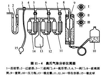采用氫氧化鈉溶液吸收CO2,以焦性沒食子酸堿性溶液吸收CO2,采用爆炸燃燒法后采用吸收法測(cè)量CH4,從而測(cè)出CH4、CO2、O2的含量。