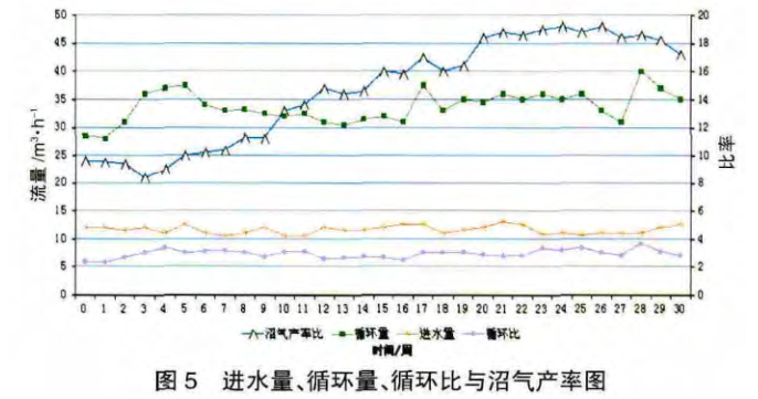 圖5為進水量、循環(huán)量、循環(huán)比與沼氣產(chǎn)率圖,從圖中可以看出,厭氧反應(yīng)器進水達到設(shè)計流量12.5m3/h左右時,厭氧反應(yīng)器出水循環(huán)量大都集中在30~40m3/h,循環(huán)比在250%~320%內(nèi)波動,1m3滲濾液沼氣的產(chǎn)率約9~19m3,沼氣的產(chǎn)率系數(shù)為每去除1kgCOD產(chǎn)生0.5m3沼氣,沼氣產(chǎn)率與COD產(chǎn)率線性相關(guān),COD的去除率直接影響到沼氣的產(chǎn)率。