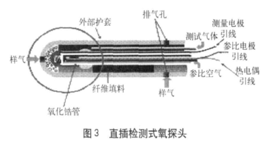 氧探頭使用時(shí),引入被測(cè)氣體的方式有直插式和采樣檢測(cè)式兩種。直插式響應(yīng)時(shí)間短、不需要加熱器、結(jié)構(gòu)簡(jiǎn)單、小型輕便,但要求同時(shí)檢測(cè)被測(cè)氣體的溫度。采樣檢測(cè)式由于氧探頭的溫度由加熱器控制,因此測(cè)量精度高、工作可靠,但響應(yīng)時(shí)間取決于氣體的流量。