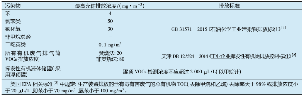目前國內(nèi)外有機(jī)化工裝置的苯和氯苯類污染物排放標(biāo)準(zhǔn)見表1。我國各項(xiàng)污染物排放標(biāo)準(zhǔn)均嚴(yán)于美國EPA的排放標(biāo)準(zhǔn)。