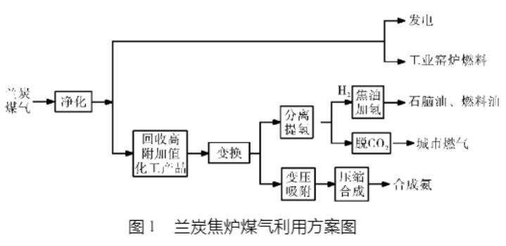 根據(jù)研究,提出的蘭炭焦?fàn)t煤氣利用方案如圖1所示。其基本思路是:首先對(duì)蘭炭焦?fàn)t煤氣進(jìn)行凈化,凈化后回收高附加值化工產(chǎn)品,然后CO變換,再經(jīng)過(guò)不同工藝生產(chǎn)包括合成氨、城市燃?xì)庖约敖褂图託渖a(chǎn)石腦油、燃料油等產(chǎn)品。