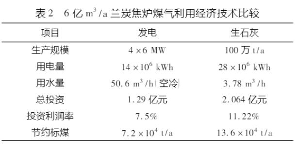 蘭炭焦?fàn)t煤氣脫硫后用于發(fā)電,以及作為生石灰、金屬鎂、水泥等工業(yè)窯爐的燃料。以60萬(wàn)t/a蘭炭廠蘭炭焦?fàn)t煤氣為例,60萬(wàn)t蘭炭廠每年生產(chǎn)蘭炭焦?fàn)t煤氣約6億m3。這些蘭炭焦?fàn)t煤氣可提供4套6MW發(fā)電機(jī)組的燃料需求,或100萬(wàn)t/a生石灰生產(chǎn)燃料需要。具體經(jīng)濟(jì)技術(shù)比較見表2。